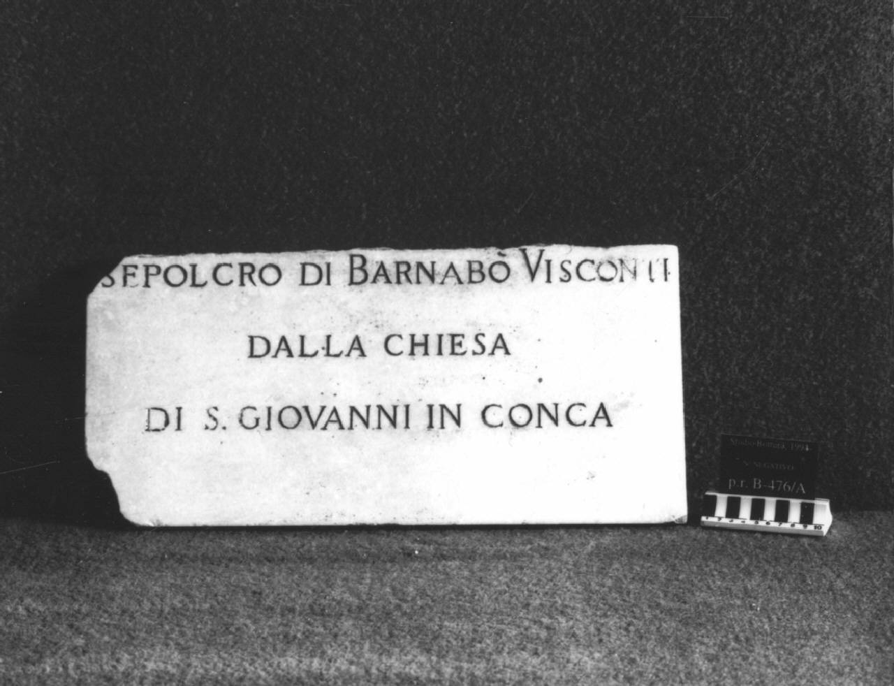 Targa rettangolare con funzione originaria di didascalia museale del sepolcro di Bernabò Visconti sul quale era appoggiata