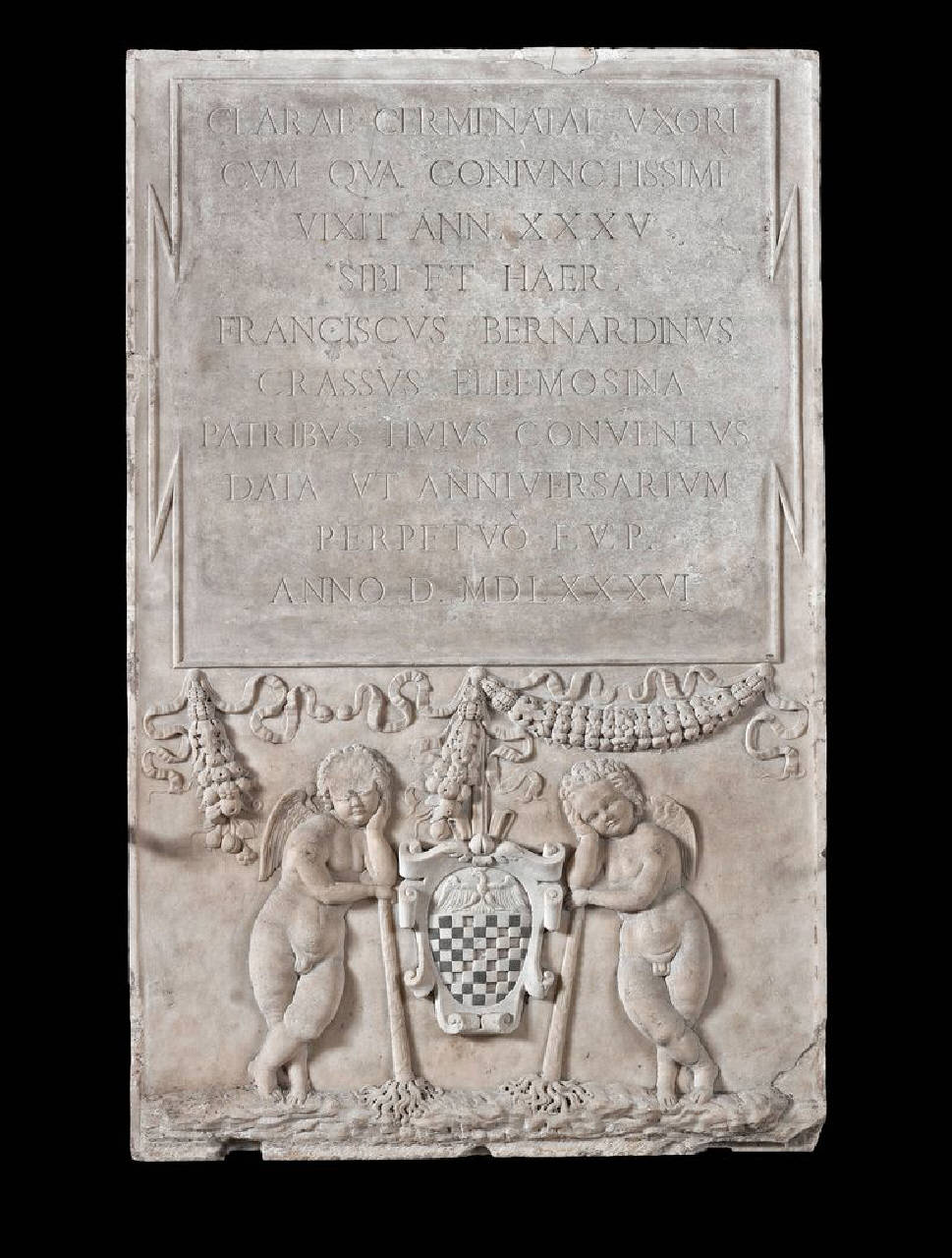 Lastra tombale rettangolare con iscrizione funeraria inserita entro tabula ansata e dedicata a Chiara Cermenate dal marito Francesco Bernardino Grassi. Nella parte inferiore, stemma della famiglia Grassi affiancato da due eroti dalle faci abbassate. Uno dei due festoni è spezzato e allude alla vita troncata.