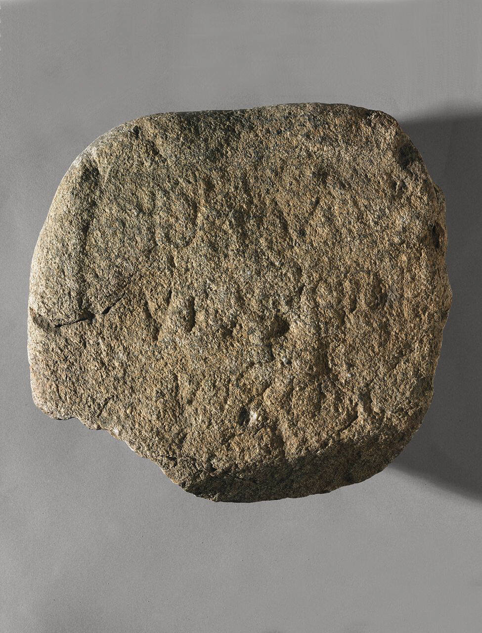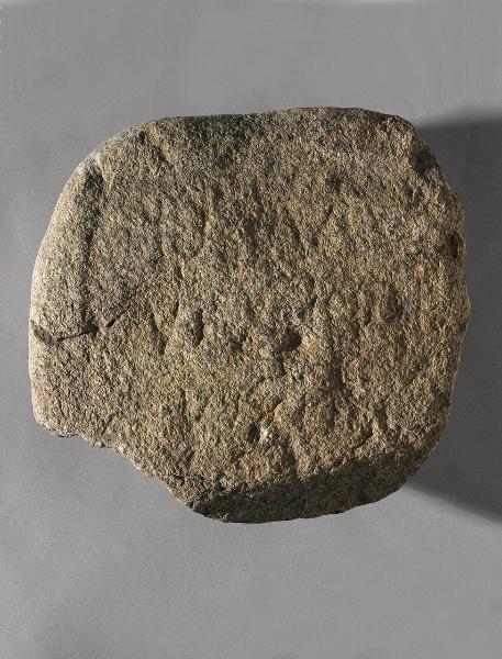 Frammento ritagliato in forma circolare appartenente a lastra o fronte di urna funeraria. Lo stato di conservazione ne rende quasi illeggibile l'iscrizione