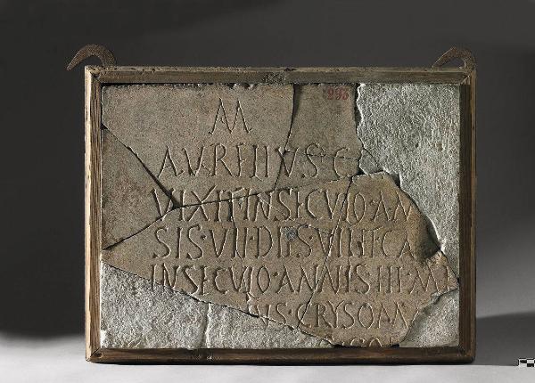 Epigrafe di Aurelius Gau(dentius) e di (Aure)lius Crysoma( )