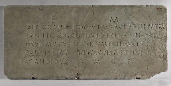 Lastra rettangolare con iscrizione funeraria cristiana che Flavius Candidus (Flavio Candido) dedica al padre Ulpius, alla madre Aurelia Valeria e a Munatia Spica. Specchio epigrafico con hederae distinguentes e cristogramma