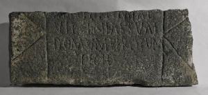 Parte di iscrizione, entro tabula ansata, dedicata ad Artemia; manca la prima riga che riportava il nome di Principio (Principius)