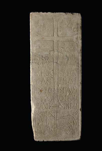 Lastra rettangolare allungata delimitata da una doppia cornice. Nello specchio, una croce patente inquadra il testo riferito a Manifrit (Manfredo?); in basso, un albero e l'agnello crucifero.