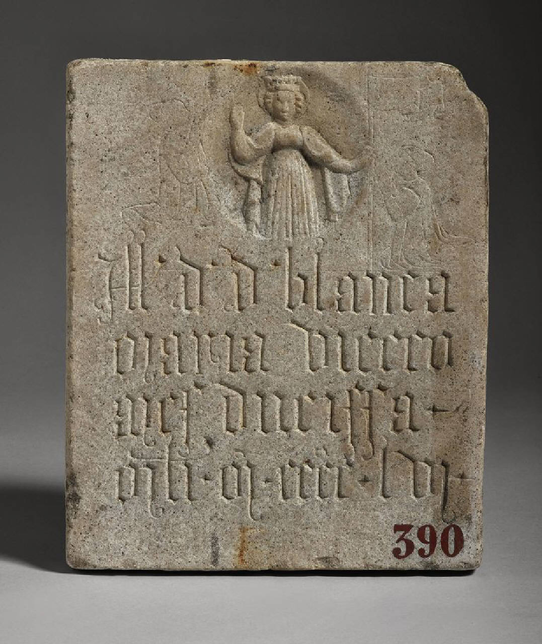 Lastra rettangolare con iscrizione relativa a Bianca Maria Visconti; in alto, entro un tondo, è scolpita una santa a tre quarti, identificata con Sant' Orsola? ; ai fianchi due devoti, a sinistra una donna, a destra un uomo reggente un vessillo scolpiti a graffito