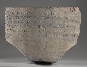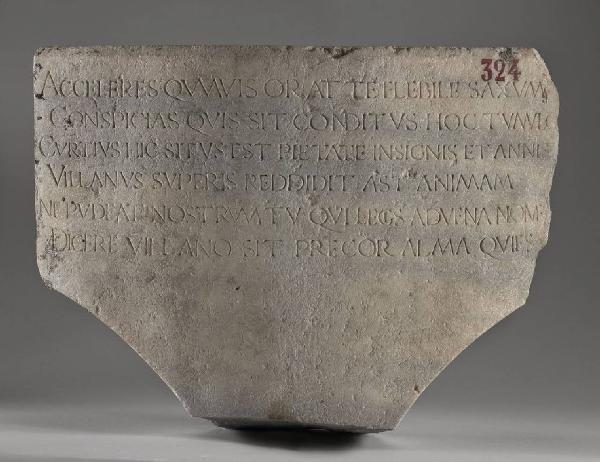 Lastra a forma di esagono irregolare con la parte finale di un'iscrizione funeraria in distici dedicata a Villano Curzio dai figli Lancino e Francesco