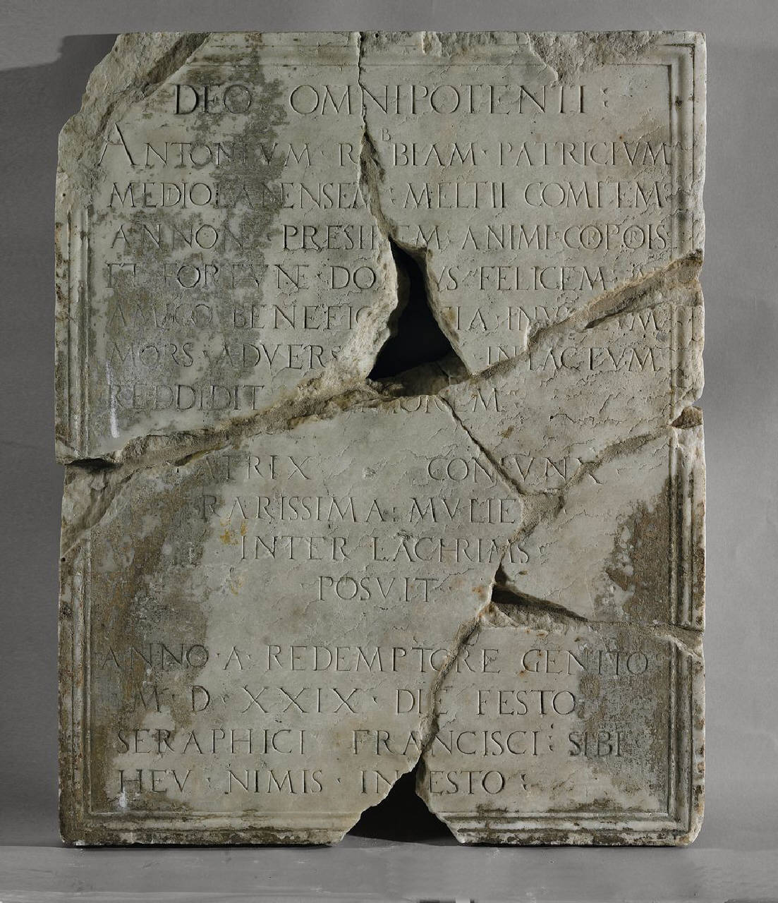 Lastra tombale rettangolare con iscrizione funeraria dedicata ad Antonio Rubia (Rabbia) dalla moglie Beatrice. Composta da sei frammenti contigui.