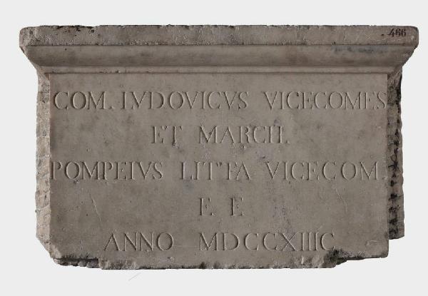 Blocco marmoreo di forma parallelepipeda con iscrizione commemorante l'erezione di un elemento voluto da Ludovico Visconti e Pompeo Litta Visconti