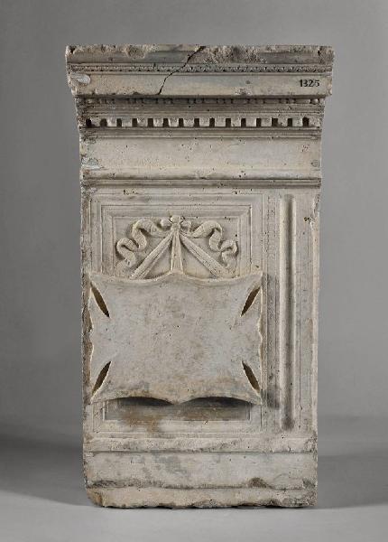 Fianchi sinistro del frontale di un camino formato da nove pezzi separati.