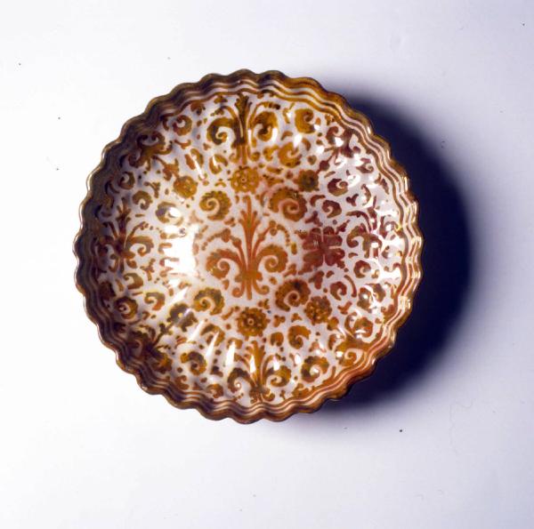 Alzata su basso piede. Parete baccellata a archettature radiali, orlo increspato, centro convesso. Modellatura mista, a stampo il piatto, tornito il fondo. Smalto grigio chiaro, impasto rosato decorato a lustro oro. La decorazione prevede motivi vegetali e floreali stilizzati, tra i quali gigli, rosette, fiordalisi e foglie ricurve crespate. L'orlo è anticipato da doppia filettatura.