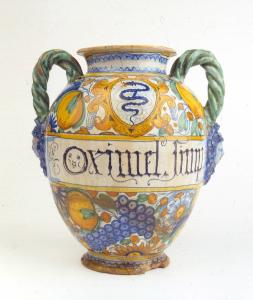 Vaso a corpo ovoidale su piede a base espansa, collo troncoconico e orlo estroflesso. Anse a torciglione impostate sulla spalla e sopra il ventre desinenti in due teste plastiche di Medusa. Modellato a tornio, smalto brillante e spesso. Dipinto in blu cobalto, nero, giallo, arancio opaco, verde diluito. La decorazione anteriore è divisa dal cartiglio del medicamento farmacologico, ossimele semplice, la parte superiore reca lo scudo araldico entro cornice barocca dei Visconti, nella parte restante si espande un ricco decoro "a fiori e frutti" con fiori a petali variopinti, mele, uva, pere, prugne, nespole e una specie di grossa zucca. Sul retro sono le estremità svolazzanti del cartiglio.