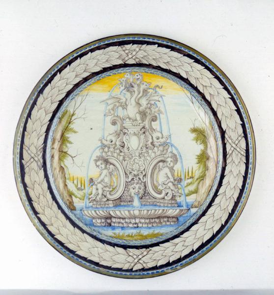 Grande piatto con cavetto poco profondo, cordonature fra tesa suborizzontale e cavetto, base apoda convessa. Foggiatura a stampo. Nel cavetto fontana monumentale con getti d'acqua che escono da un'idra alla sommità, da delfini intermedi e alla base da due putti e da un mascherone. Sullo sfondo paesaggio montuoso. Nella tesa fascia con ghirlanda di foglie di alloro in grigio bruno su fondo a manganese. Smalto azzurro- grigio. All'esterno, in corrispondenza dell'attacco della tesa, quattro piantine schematiche equidistanti.