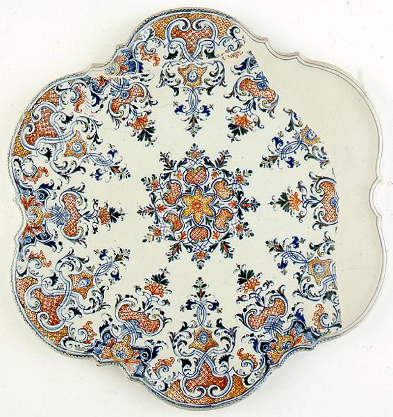 Alzata esalobata a profilo rilevato su basso piede circolare. Decorazione a gran fuoco nei colori blu, verde, giallo e rosso ferro. Ornato 'a merletto' a struttura radiale 'alla rouen' e 'a lambrequins rajonnants'. Il modulo base del decoro riprende la leggerezza dell'intreccio delle griglie in ferro battutto con motivi 'alla ferronierè'. Nel tessuto decorativo sono piccole teste umane e mascheroni grotteschi. All'esterno sigla e firma per esteso in blu.
