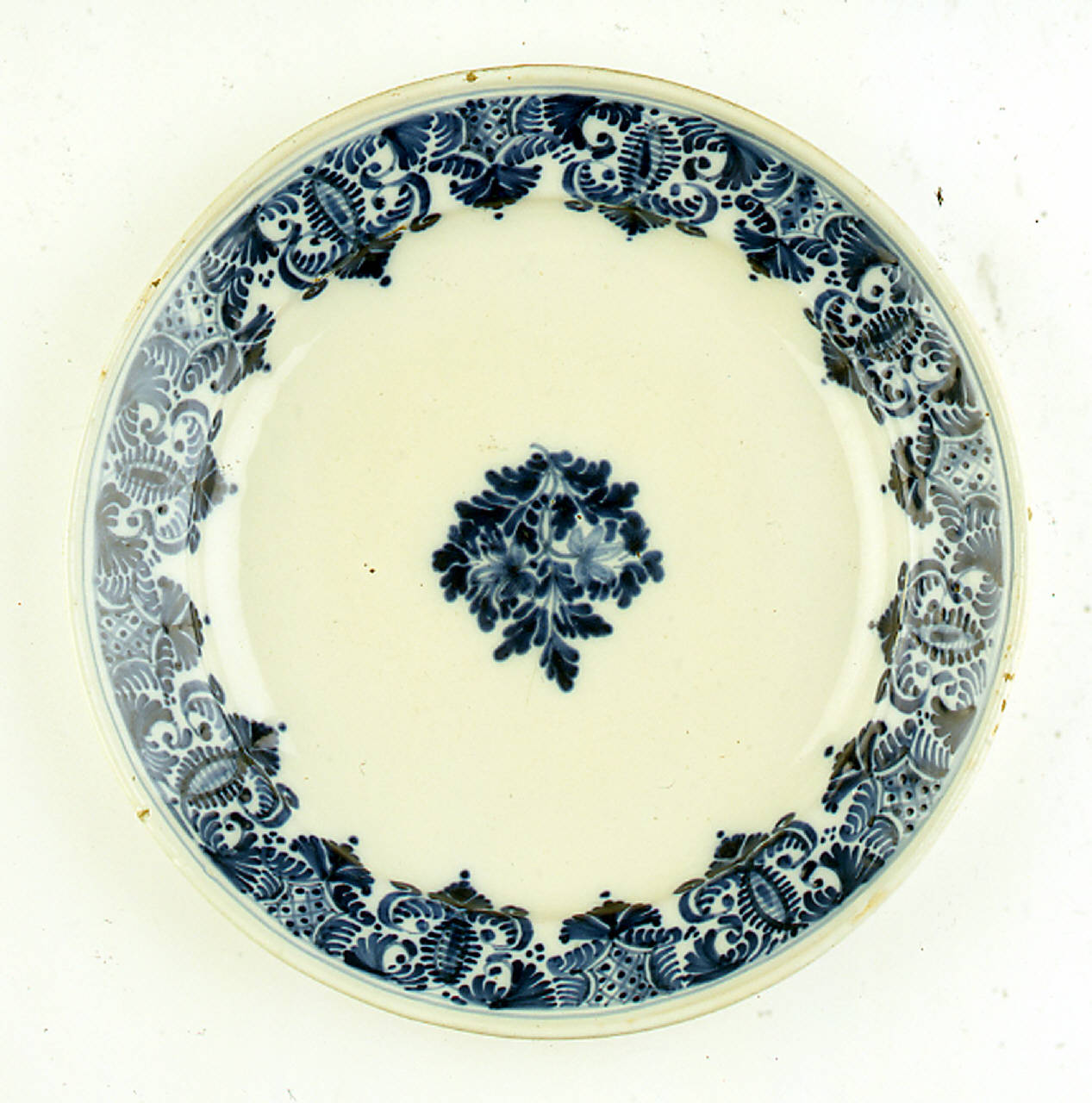Grande piatto tondo dall'orlo liscio con bordo rilevato e tesa inclinata decorata da un motivo rayonnant con elementi a "C" intersecati a formare disegni a farfalla alternati a piccole riserve. Al centro un medaglione con un motivo floreale composto da due steli che si intersecano per reggere due fiori stilizzati su un fitto fondo fogliato.