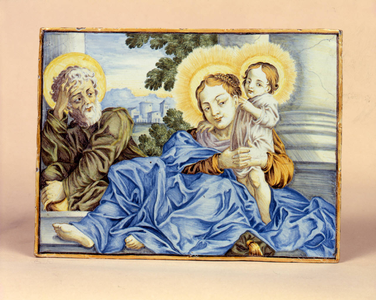 Mattonella profilata in bruno e arancio istoriata con la Sacra Famiglia. Sulla destra San Giuseppe con il braccio sinistro a sorreggere la testa, sulla sinistra la vergine e il Gesù Bambino con le aureole raggiate. A fare da sfondo un colonnato, la vegetazione e un paese che si scorge in lontananza.