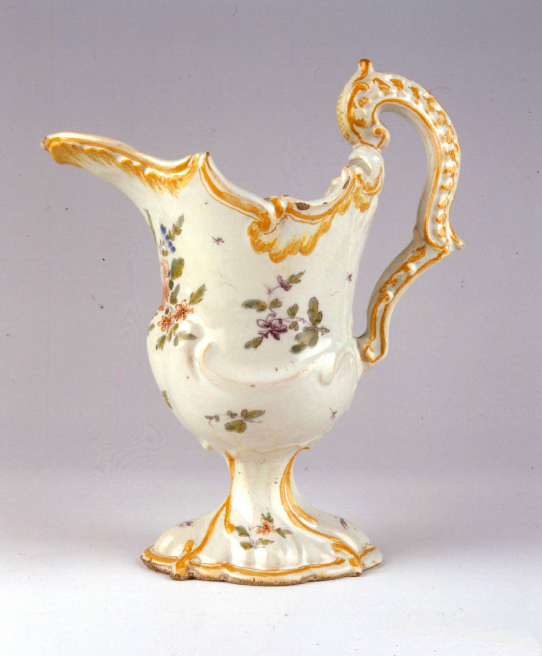 Brocca su alto piede con base rigonfia con costolature verticali in leggera torsione, la parete del calice è arricchita da effetti rocaille. L'ansa a doppio ricciolo è decorata da increspature e si attacca all'orlo della bocca. Il becco frontale si sporge notevolmente dal corpo. La decorazione è costituita da motivi frangiati giallo-aranciati che sottolineano la morbidità del modellato sull'ansa, al piede e lungo il labbro dell'invaso. Sul fronte è dipinto un mazzo floreale con una rosa. Tavolozza a gran fuoco nei colori rosso, manganese, blu e verde.