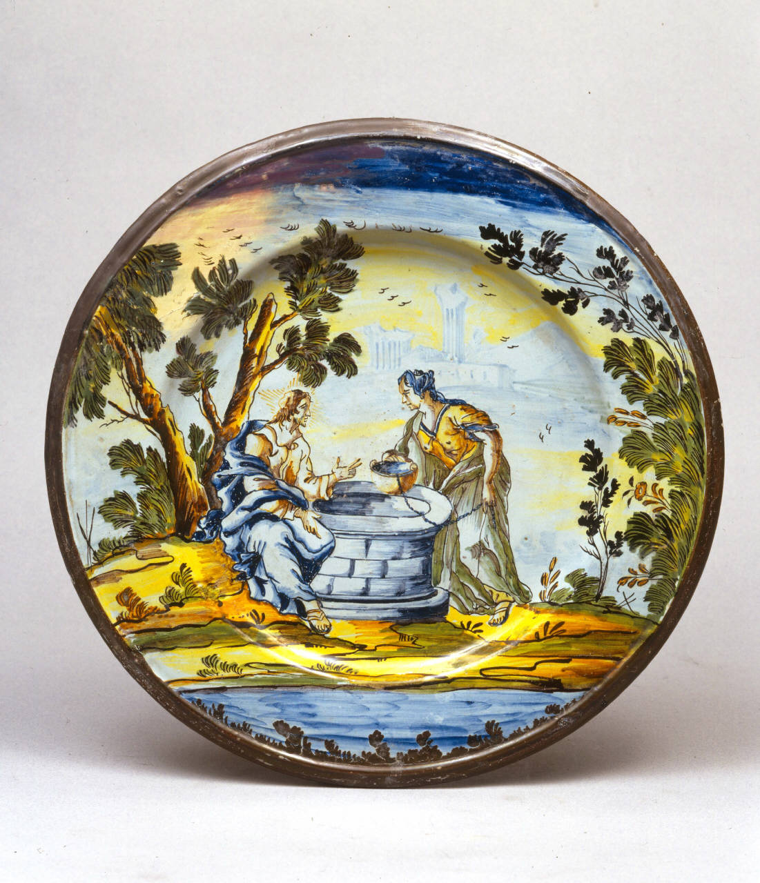 Grande piatto con tesa suborizzontale, orlo ingrossato con rialzo interno, base apoda convessa. Foggiato a stampo. Decorazione "a scenografia barocca" a pieno campo con Cristo seduto accanto al pozzo e di fronte a lui la Samaritana con un secchio; alle spalle di Cristo alberi, a destra quinte di cespugli nascenti dal bordo, sfondo a paesaggio montuoso con edifici turriti e uccellini schematici. Orlo a fascia in manganese. All'esterno in corrispondenza del flesso fra cavetto e tesa cinque grandi piantine schematiche a girandola e al centro la data 1723 in blu.