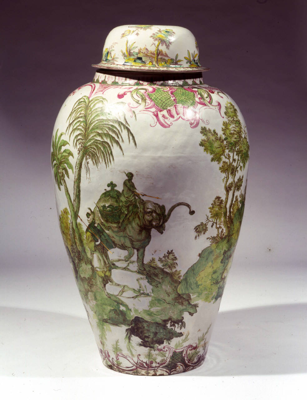 Grande vaso con corpo ovoidale espanso superiormente su base a disco, corto collo cilindrico, coperchio a calotta ribassata e corta tesa. Modellato a colombino con superficie irregolare. Superficie esterna rivestita da smalto bianco, interno del collo da vetrina verde.\nBase e collo con decorazione a virgole e conchiglie rocaille a formare riserve con motivi a graticcio, al collo motivi a pendone. \nSulla parete importante scena istoriata: un uomo armato stante con turbante osserva una donna che conduce un elefante. Sull'altro lato due donne conversano vicino a un cammello che ha in groppa un uomo con parasole. Coperchio con decorazione a zolle con vegetazione e casette. Decorazione istoriata in due toni di verde a smalto e a piccolo fuoco, è delineata a tratto nero e con particolari in oro (lance). Fasce alla base e al collo integrate da colorazione rosa magenta.