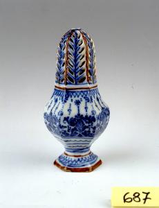 Spargizucchero su basso piede esagonale forato, corpo a balaustro a sezione esagonale cuspidato e traforato in alto, smaltato all'interno e all'esterno. Decorazione a profilature al piede e alla carenatura prima della terminazione cuspidata. Ornato 'a merletto' in monocromia blu cobalto con motivo a 'C' intrecciate e file di puntini e asterischi, motivo spigato in corrispondenza della foratura cuspidale.
