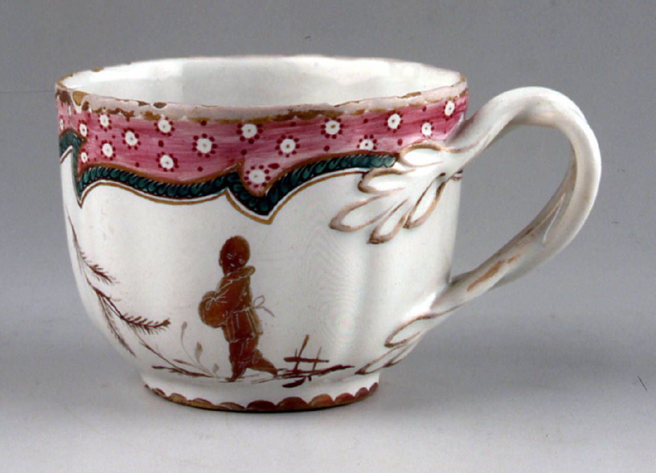 Tazzina centinata con manico intrecciato a foglia. Ornato con figura cinese andante e tralci fioriti in oro.