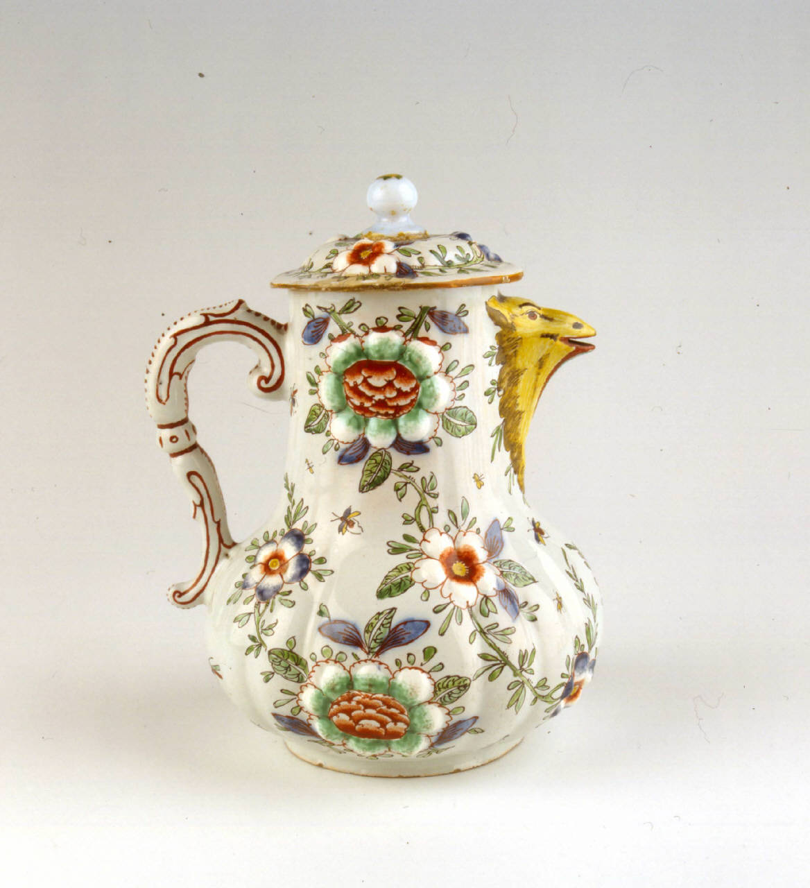 Caffettiera su base circolare, corpo baccellato con collo lungo, versatoio a testa di grifo, manico a voluta, coperchio con terminazione a pigna, decorazione con fiori a rilievo, racemi, insetti.