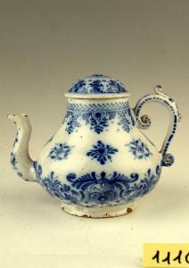 Teiera su basso piede svasato, corpo piriforme, ansa con terminazioni a riccioli all'attacco del corpo, cannello montante e angolato presso la bocca, coperchio a calotta ribassata. Decorazione monocroma blu di cobalto con motivo a graticcio a larga maglia alla base, sopra, motivo a merletto con margherite e motivi fogliati stilizzati, collo con pendoni sotto fascia a zig zag. Radi fiori sulla spalla e sul versatoio.