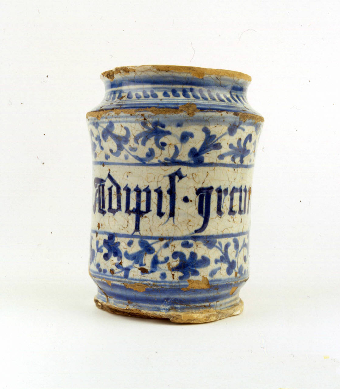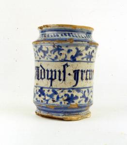 - NOTIZIE STORICO CRITICHE Provenienza non documentata. \nIl pezzo è stato originariamente attribuito a Cafaggiolo e poi a Faenza, tuttavia la stilizzazione del motivo "alla porcellana" trova riscontri in frammenti trovati a Urbino e in scavi a Pesaro (Berardi 1984, pp. 309-310, figg. 102-104) e conservati nella Galleria Nazionale delle Marche. Il manufatto rientra nella tipologia dell'alberello correlato, inv. maioliche 1120, attribuito all'ambito marchigiano ma in relazione con l'area veneta per gli accertati scambi di maestranze fra le due zone. La scrittura ADIPIS IRCINUS si riferisce al grasso di capra usato in medicina come antidoto contro l'avvelenamento e per curare la dissenteria e la podagra.