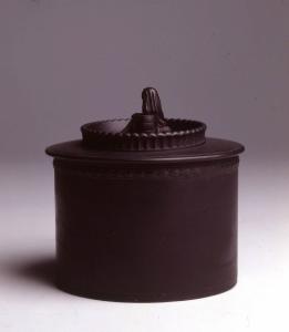 Zuccheriera a base ovale con parete liscia decorata in alto da una sottile fascia con catena di coppie di piccole foglie tra due filetti punteggiati, base profilata da tre leggeri solchi. Il coperchio ha tesa piatta e bordo lobato a rilievo che incornicia la presa centrale modellata a forma di donna velata, seduta con la testa appoggiata ad una mano.