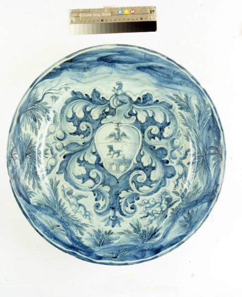 Piatto da parata rotondo ornato, sui toni dell'azzurro, con grande stemma collocato fra arbusti.