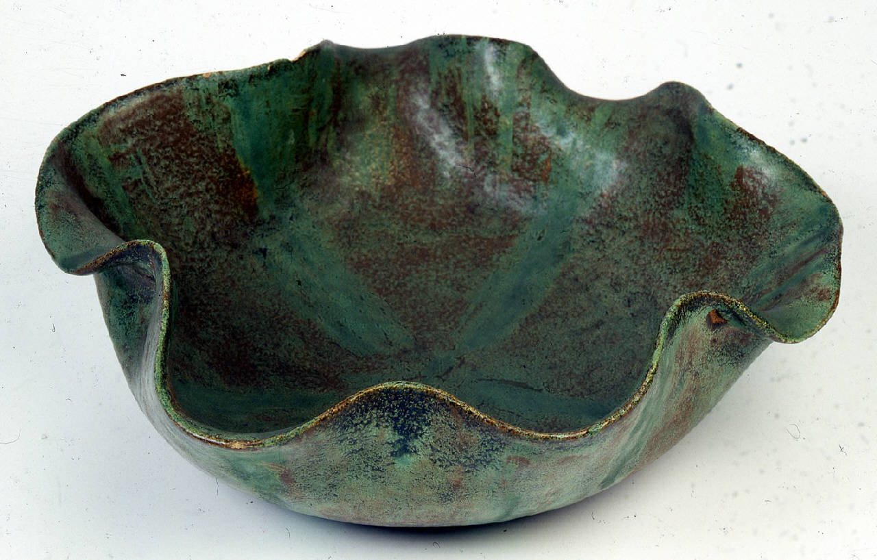 Coppa dalla parete liscia e mossa con bordo polilobato. Coloer verde-bruno con effetto lapin.
