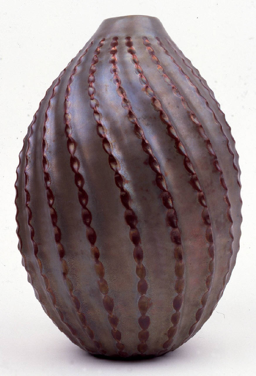 Vaso ovoidale su base circolare, corpo percorso da costolature tortili a tacche ramate. Bocca stretta. Colore verde.