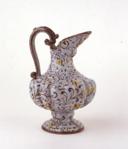 Versatoio a ventre piriforme bacellato, imboccatura a mandorla con mascherone a rilievo sottostante, piede su stelo con nodo mediano, ansa sopraelevata a volute contrapposte. Foggiata a stampo. Medaglione frontale con paesaggio montuoso, edifici a castello turrito incorniciato da una catenella. Il resto del recipiente è ornato a tappezzeria da rametti a volute con foglie e gruppi di tre bacche. Medaglione in policromia, decorazione restante in manganese a esclusione delle bacche, in giallo. Il medaglione a rilievo sotto l'imboccatura risulta ignorato dalla decorazione dipinta. Smalto azzurro-grigio, marca assente.