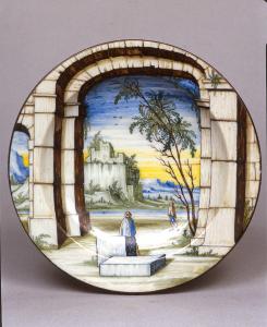 Scodella con tesa leggermente obliqua e base apoda piana. Foggiata a stampo. Decorazione a tutto campo con edificio in rovina a due archi ribassati, due viandanti e blocchi di pietra in primo piano. Sullo sfondo paesaggio montuoso con edifici arroccati. Smalto azzurro-grigio dipinto in blu, giallo, verde, bruno. Sul verso, equidistanti fra loro sotto la tesa, 6 piantine schematiche in manganese e il monogramma AF sormontato da due rami di palma incrociati, coretta o spronella e corona.