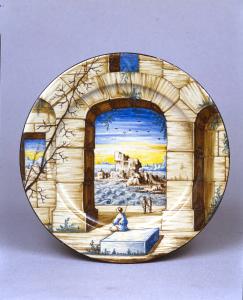 Piatto tondo con tesa leggermente obliqua, base apoda convessa. Foggiato a stampo. In primo piano rovine monumentali a grossi blocchi squadrati con figurine di viandanti e nello sfondo paesaggio costiero con onde in burrasca e edificio in rovina. Smalto azzurro-grigio dipinto in blu, giallo, verde, bruno e manganese, sottile cornice in manganese. Sul verso, sotto la tesa 5 piantine schematiche e la marca tracciata in manganese.