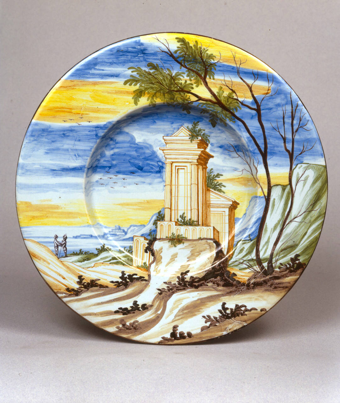 Grande scodella con cavetto poco pronunciato e larga tesa obliqua. Base apoda convessa, quasi piana. Foggiata a stampo. Decorazione a tutto campo di paesaggio costiero con al centro un edificio classico, forse un mausoleo. A desta due alberi sinuosi, privi o con poche fronde, a sinistra due viandanti affrontati che si tengono le mani. Smalto dipinto in blu, giallo, verde, bruno e manganese, sottile profilo in manganese. Sul verso, sotto la tesa 5 piantine schematiche in manganese.