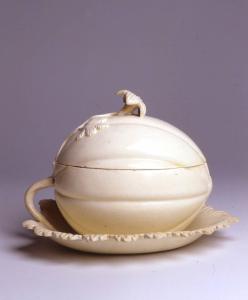 La salsiera imita la forma di un melone disteso su sottopiatto a foggia di foglia. Il 'melone-salsiera' è tagliato ad altezza superiore a quella del diametro orizzontale, la calotta superiore funge da coperchio, impugnabile mediante fiore a petali estroflessi e striati, al vertice di un rametto a rilievo con foglie, nascente dal picciolo. La vernice è paglierina, chiara, tendente al verdino. Sul retro è inciso il marchio di fabbrica.