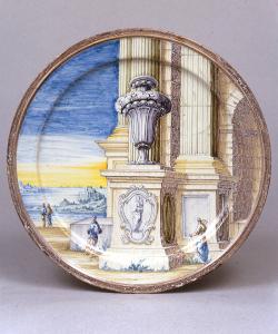 Piatto tondo con tesa modanata, cavetto poco pronunciato, base apoda. Foggiato a stampo. Decoro a pieno campo, in primo piano rovine monumentali con al centro un grande vaso su un basamento ornato da figura femminile entro cornice a volute, ai lati quattro figurine di viandanti e nello sfondo paesaggio costiero. Lungo l'orlo fascetta viola spugnata. Smalto bianco dipinto in blu, giallo, verde, bruno e manganese. Sul verso, lungo il bordo, marca tracciata in manganese.
