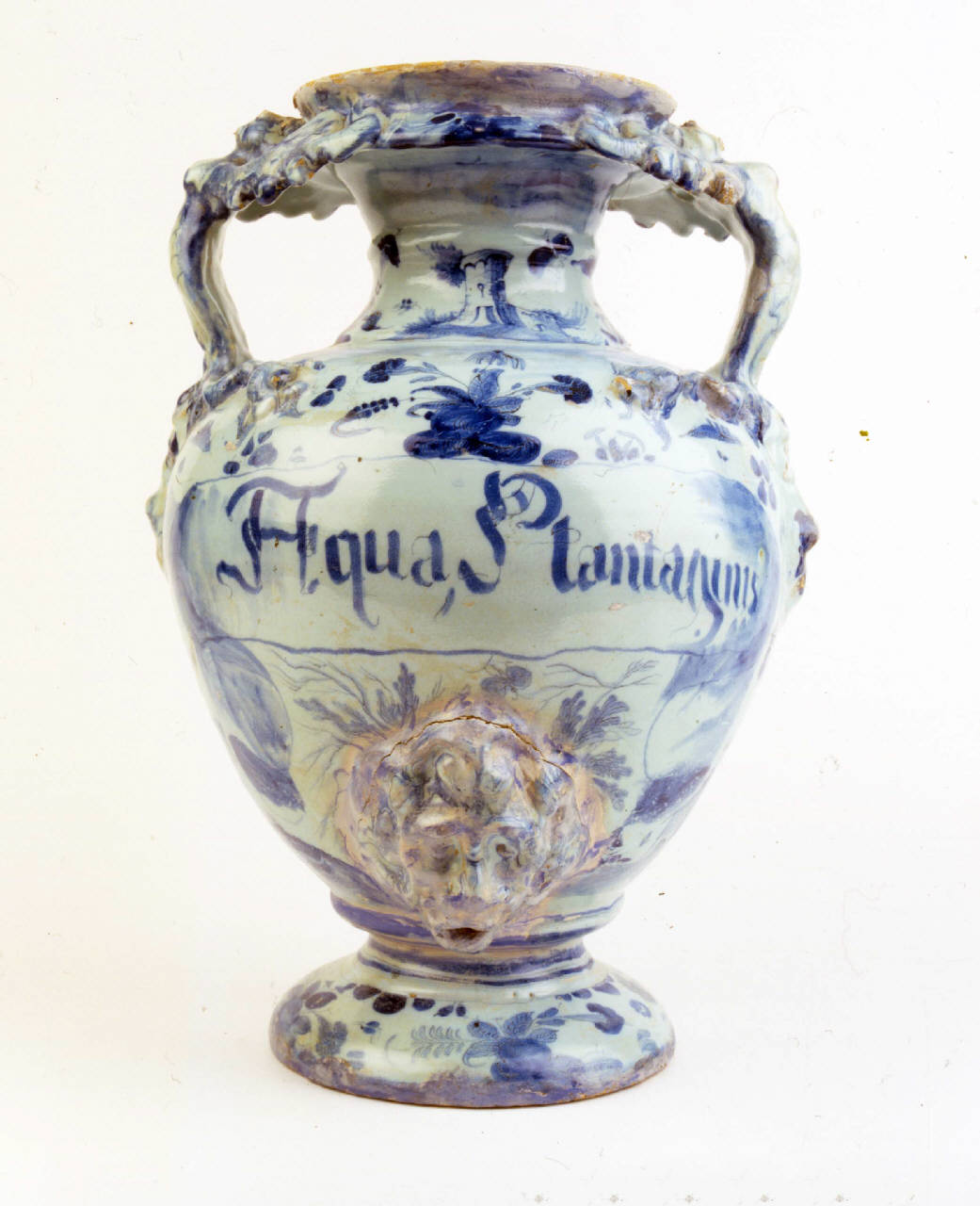 Grande vaso da farmacia con piede circolare, corpo ovoidale, collo su cui si innesta una bocca espansa. Anse a forma di arpie, alle cuie estremità sono posti due mascheroni. Rubinetto a mascherone al centro, sotto cartiglio. Decorazione a fiori, cespugli, castello, elementi vegetali e fanciullo comn corona di alloro raffigurato nell'atto di correre con messi tra le mani.