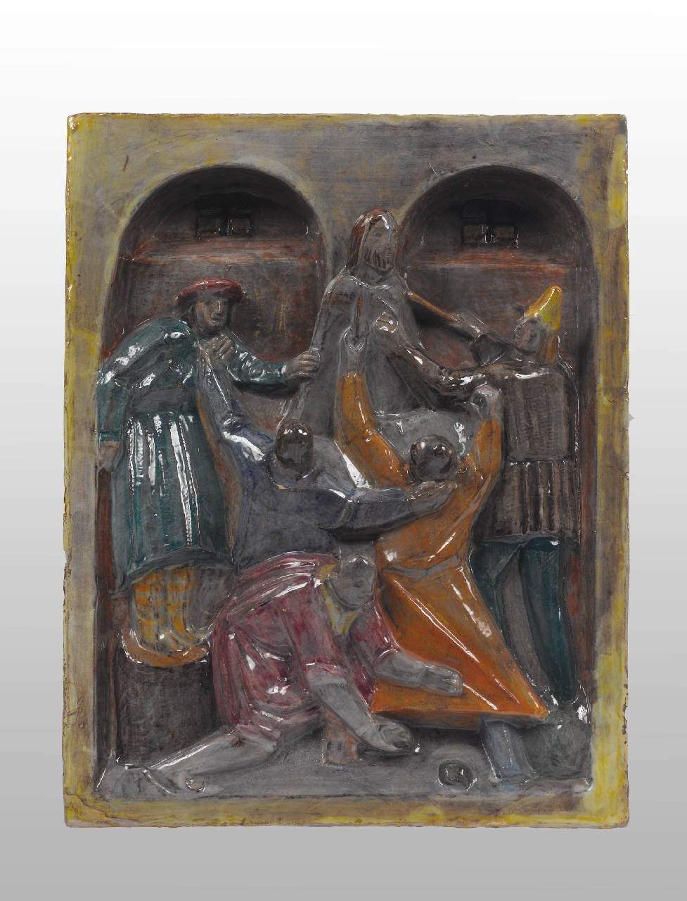 - NOTIZIE STORICO CRITICHE "Modellata da Arturo Martini e prodotta e decorata da Manlio Trucco presso la manifattura La Fenice per conto della società Savona Nuova di Mario Labò" (cfr. Stringa, in Museo Arti, 2002). Si tratta della prima formella delle sei decidate da ARturo Martini alla "Via Crucis" tra il 1926 e il 1927.