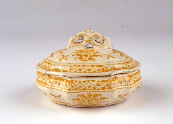 Zuccheriera o piccolo contenitore con altra funzione a pianta ovale polilobata e coperchio convesso con presa a rocaille. Realizzato a stampo con decoro su smalto bianco in monocromia gialla. Decorazioni a fascia con losanghe puntinate all'orlo del contenitore e del coperchio, vasca e calotta con decoro a mazzetti. Retro privo di marca.