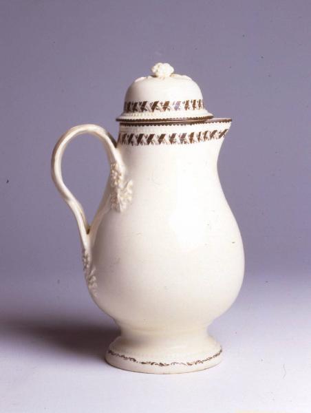 Caffettiera dal corpo piriforme su alto piede svasato, piccolo becco liscio, ansa intrecciata con attacco a forma di fiore e foglia d'acanto. Il coperchio, con stretta tesa e calotta rigonfia ha presa con fiore e foglie in rilievo. Un sottile bordo perlinato a rilievo corre al piede, all'orlo e sulla tesa del coperchio. La base è color crema mentre la decorazione è in monocromia bruno scuro con l'orlo della bocca e del coperchio profilato da un filetto ondulato cui si affianca un severo motivo a nastro pieghettato. Il piede è profilato da un leggero anello di virgole fogliate. Sotto il piede marca impressa.