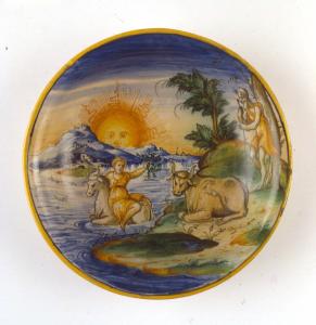 piatto a corpo poco profondo, parete ricurva con orlo estroflesso, piede a baso anello. Modellato a tornio, smalto brillante con colorazione leggermente giallognola e poco coprente, dipinto in blu cobalto, bistro, giallo antimonio e ferraccia, arancio, bruno e viola di manganese, verde ramina, bianco di stagno. E' rappresentato l'episodio mitologico di Europa rapita da Giove tramutatosi in toro. La giovane è seduta in groppa all'animale mentre viene trascinata nel fiume, agita una ghirlanda di foglie che tiene in mano. Assistono alla scena un vecchio barbuto con bastone e un bue accosciato. Sul fondo, dietro alla collina con piccoli paesi, spunta un sole con volto umano. Orlo profilato in giallo.