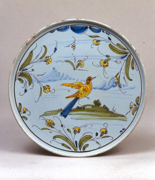 Sottocoppa piana con orlo rialzato, alto piede ad anello. Probabile foggiatura a stampo. Al centro uccellino su isola di terreno erboso, intorno tre cespugli fioriti nascenti dall'orlo. Riempitivi floreali e velature azzurre. Smalto azzurro. All'esterno quattro piantine schematiche.