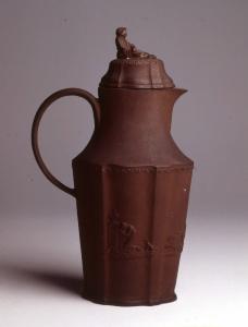 Caffettiera con forma allungata e mossa, molto ricercata, ampia ansa ad orecchio. Sul corpo decorazione a rilievo con scene di sacrificio "all'antica". La presa del coperchio è invece modellata in una figura di dolente. Marca impressa sul fondo.