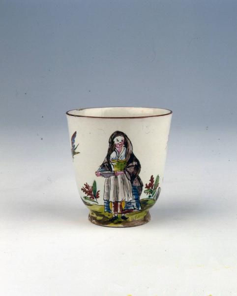 Tazzina a campana, piede circolare, orlo leggermente svasato. Decorazione con contadina e albero.