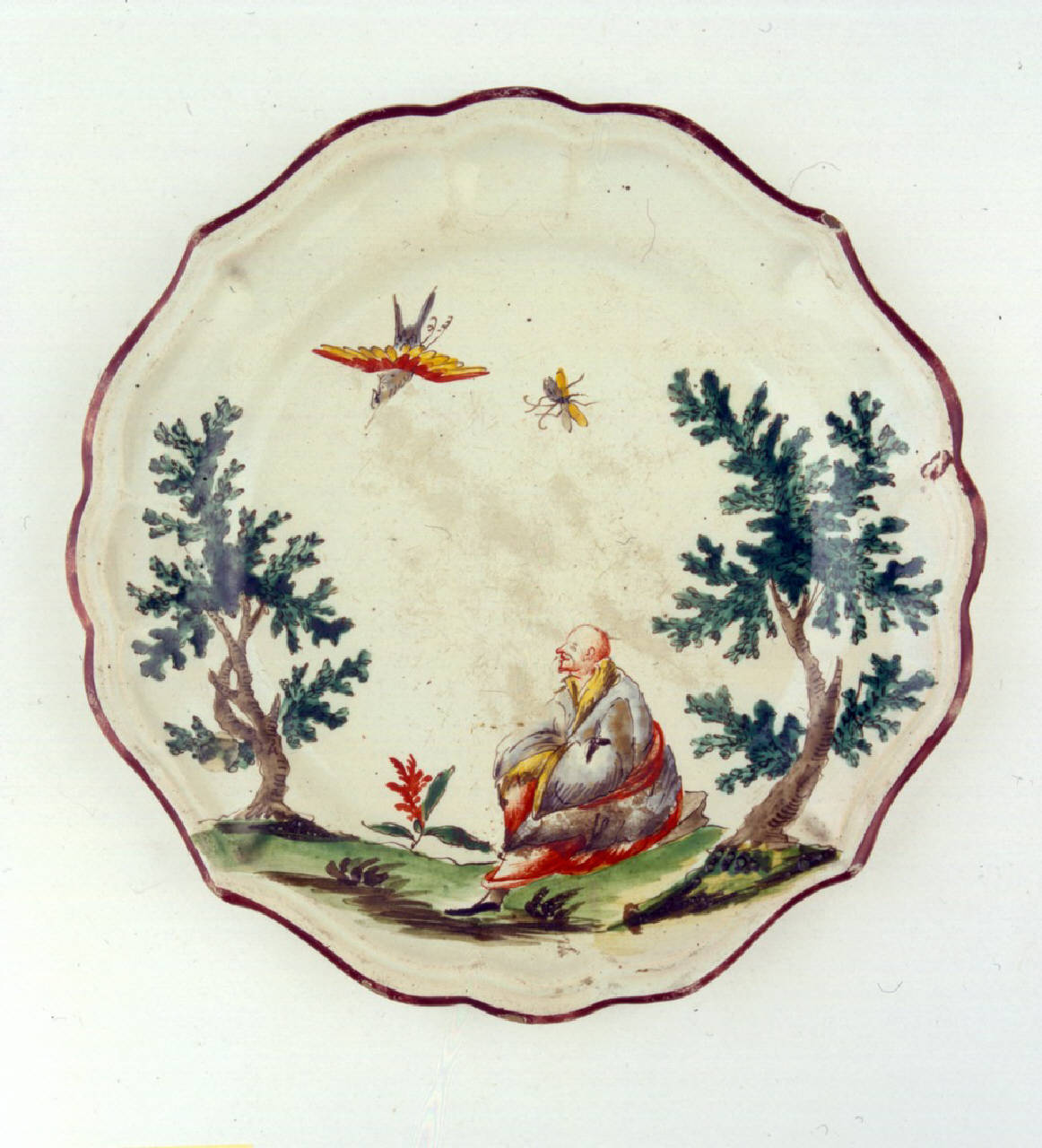 Piatto piano sagomato a quattro punte con orlo color bruno ornato con figura maschile tra due alberi.