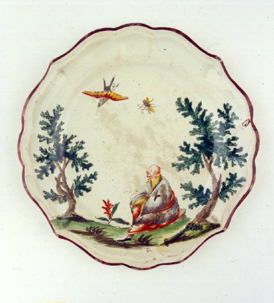 - NOTIZIE STORICO CRITICHE Piatto parte di un assortimento formato da centoquarantotto pezzi decorato "a paesini e figure a smalto" (cfr. Inventario manifattura Clerici 1788, A.S.M., Commercio 199), databile dopo il 1756, anno di adozione della tecnica a piccolo fuoco nella manifattura. A questa raccolta appartiene un piatto con la marca di Felice Clerici e la data 1767 (n. INV. 2338) (cfr. Ausenda, in Museo Arti, 2001).