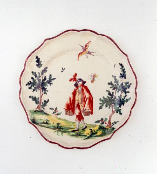 Piatto medio sagomato a quattro punte con orlo color bruno ornato con figura maschile vestita di rosso con cappello piumato e due cestini tra due alberi.