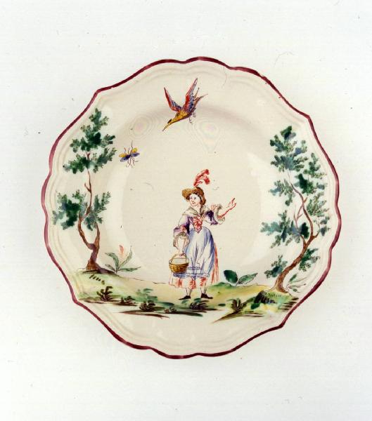 Piatto fondo sagomato a quattro punte con orlo color bruno ornato con figura femminile con cestino tra due alberi.