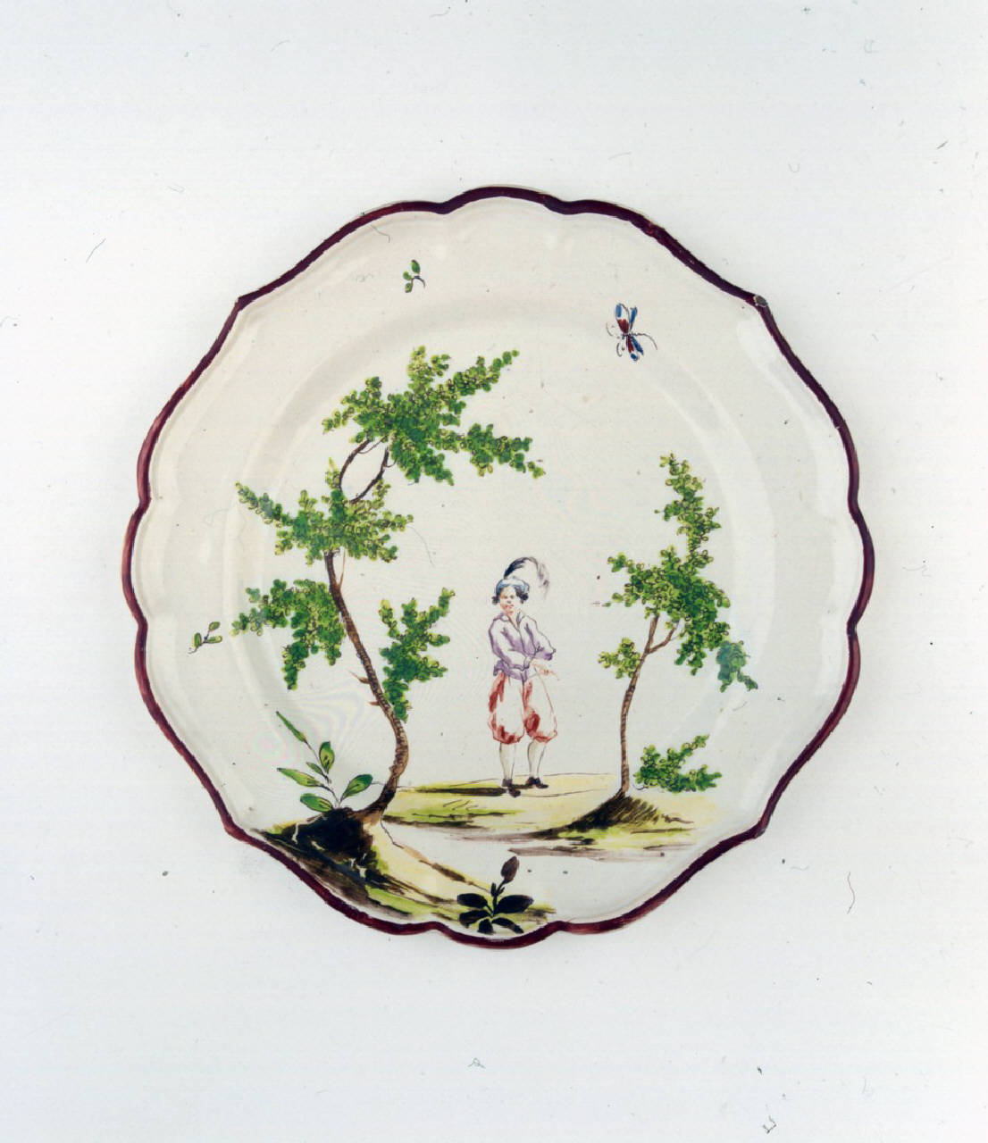 Piatto medio sagomato a quattro punte con orlo color bruno ornato con figura maschile tra due alberi.