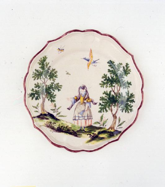Piatto medio sagomato a quattro punte con orlo color bruno ornato con figura femminile della Commedia dell'Arte tra due alberi.